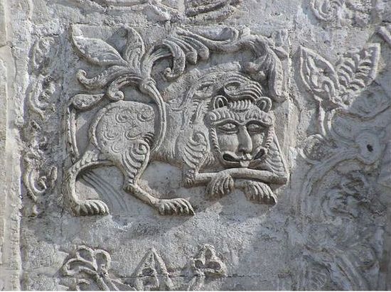 The inhabitants of Vladimir-Suzdal, who had never seen lions as they were not native to Rus’, reportedly asked the Italians what they looked like. The Italians had great difficultly describing them, as the closest animals to lions that the people were familiar with were supposedly cats, and so the Italians reportedly said that lions look like cats, only much bigger and more deadly. As a result, the lion heads carved onto many Russian churches of that period simply looked more like giant cats with eerily human-like faces than typical Greco-Roman or renaissance style lion sculptures.