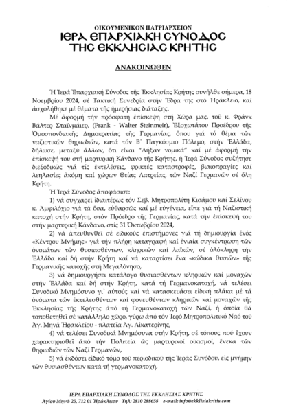 The Holy Eparchial Synod of the Church of Crete met on Monday, 18 November 2024, in a Regular Session at its Headquarters in Heraklion and, among other things, discussed in detail the executions, horrific destruction, acts of violence and looting, even of places of Sacred Worship, committed by the Nazi Germans throughout Crete.