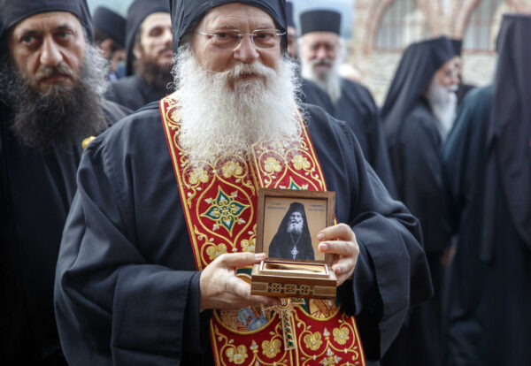 În fotografie Starețul Efreme într-un moment din primirea moaștelor Sfântului Ieronim Simonopetritul, Mănăstirea Vatopedi, Muntele Athos.