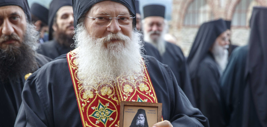 În fotografie Starețul Efreme într-un moment din primirea moaștelor Sfântului Ieronim Simonopetritul, Mănăstirea Vatopedi, Muntele Athos.
