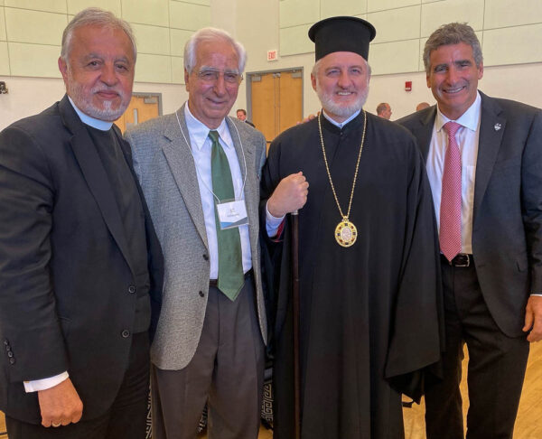 Pictured with Archbishop Elpidophoros from right are Dr. Katsouleas, his father Steven Katsouleas and Rev. Alex Karloutsos, Vicar General of the Archdicoese.