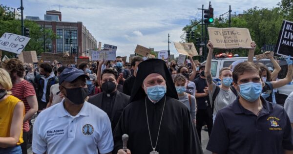New York, NY – At the invitation of the Borough President of Brooklyn, Eric Leroy Adams, and State Senator Andrew Gounardes (New York’s 22nd State Senate District), His Eminence Archbishop Elpidophoros attended a peaceful protest and march today in Crown Heights, Brooklyn over the killing of Louisville EMT Breonna Taylor. (Breonna Taylor, a 26-year-old emergency medical technician, was killed when the police raided her apartment in Louisville, KY in March.)
