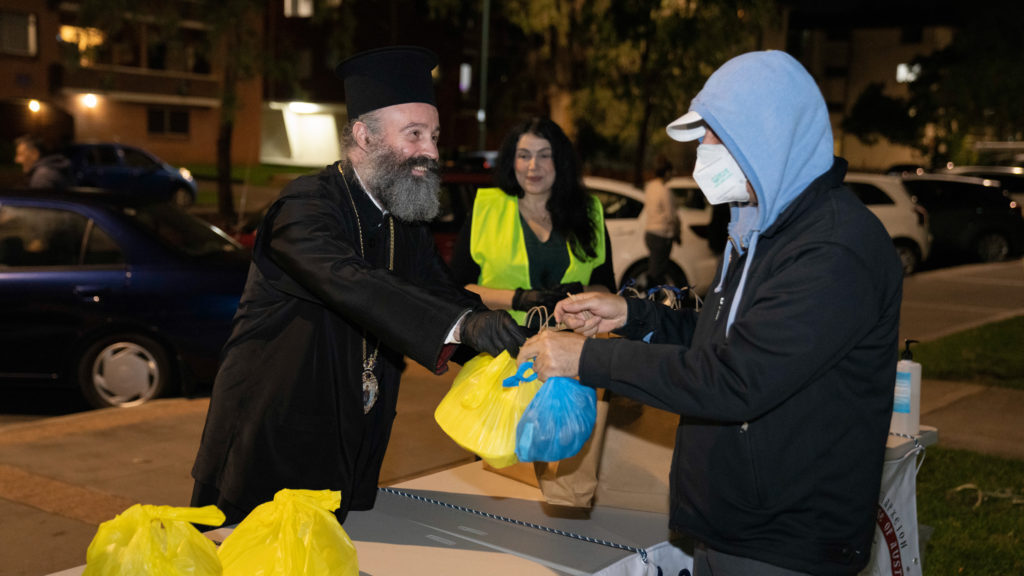 During his visit to Hart Park, His Eminence Archbishop Makarios took the opportunity to speak with the volunteers and to congratulate them for their God-pleasing work that they perform. He encouraged them to continue with the same zeal and fervour and then did not hesitate to put on the gloves himself, observing the required protective measures, and to assist with the distribution of the meals.