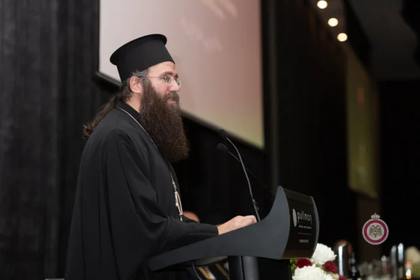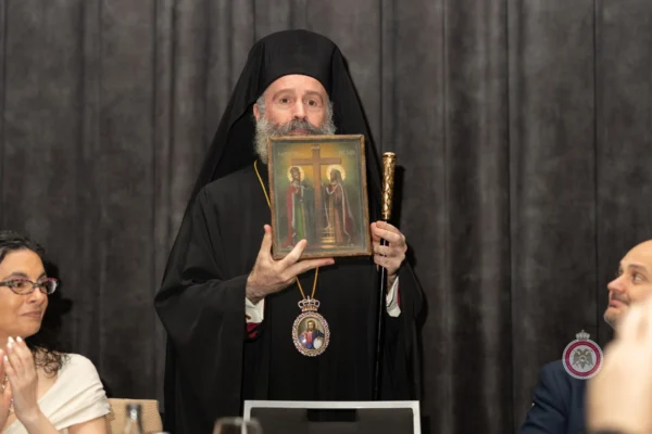 In one of the most moving moments of the evening, His Grace Bishop Prodromos of Toliara and Southern Madagascar delivered a warm fraternal address to His Eminence Archbishop Makarios of Australia and, with the aid of audiovisual material, presented the God-pleasing missionary work being carried out in his diocese with the decisive support of the Orthodox Church in Australia. As a token of gratitude, His Grace bestowed upon the Archbishop the Highest Distinction of the Holy Diocese of Toliara and Southern Madagascar and presented him with an icon of the Holy and Glorious Equal-to-the-Apostles Saints Constantine and Helen.
