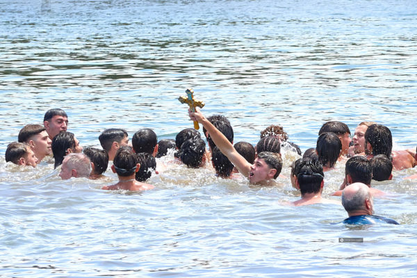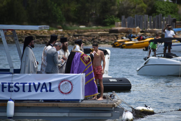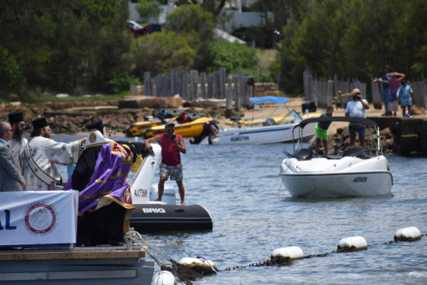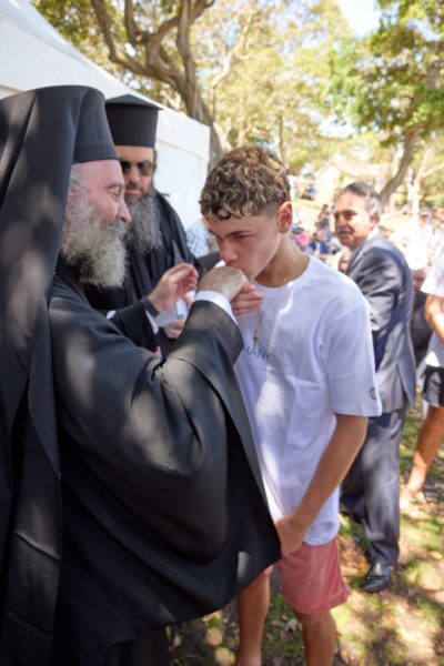 His Eminence Archbishop Makarios of Australia, who was joined by Their Graces, Bishop Iakovos of Miletoupolis and Bishop Christodoulos of Magnesia, Chief Secretary of the Holy Eparchial Synod, as well as by all the clergy of the city of Sydney, blessed the waters of the Pacific Ocean and threw the Holy Cross into the sea, in which more than 120 young believers dived in order to retrieve the Cross. The Cross was retrieved by the young Dionysios Petri, who received the Archbishop’s paternal blessing, as did the other swimmers.