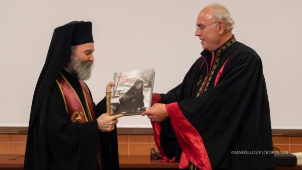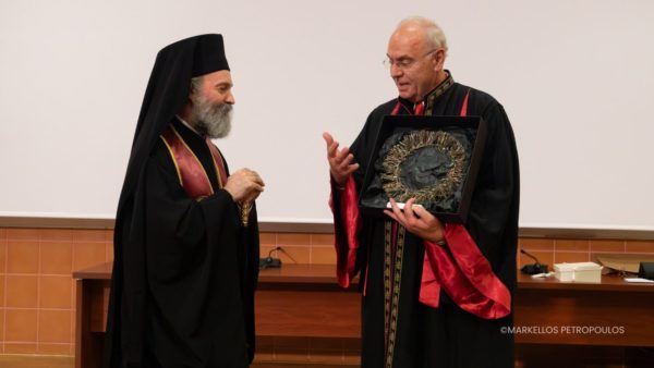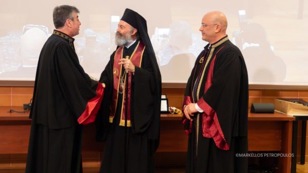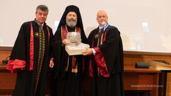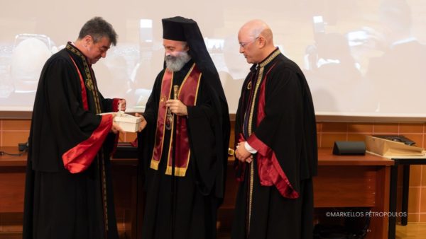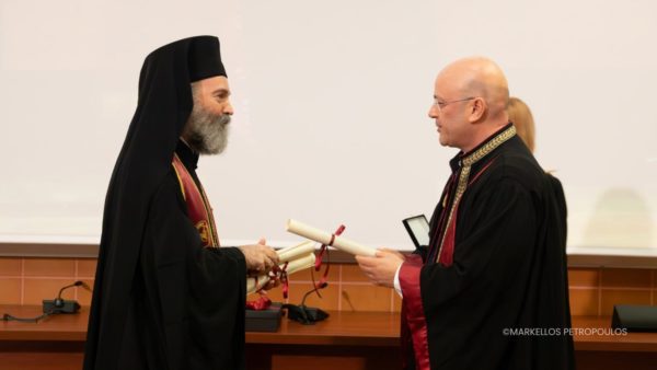 The commendation for the honouree was delivered by Professor Athanasios Giannoukas, specialist in Vascular Surgery, who described the Archbishop as “a man whose life and witness exemplify spiritual cultivation, scientific integrity, and selfless love for humanity.” He emphasised the Archbishop’s contribution to the university in fostering the “scientific conscience and moral responsibility of young scientists, highlighting the need for medical knowledge always to be accompanied by humanity, respect, and a sense of the sacredness of life.”