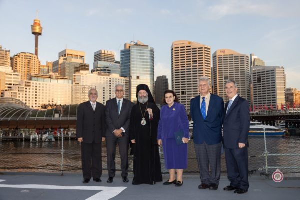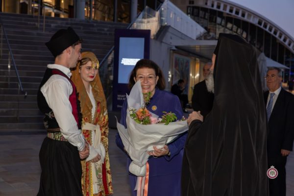 The event was honoured by the presence of His Eminence Archbishop Makarios of Australia and the Greek Minister of Culture, Ms. Lina Mendoni, who was accompanied by her special adviser, Ms. Anna Panagiotarea, and other associates. At first, the Archbishop and the Minister were guided through Australia’s National Monument to Migration—known as the “Welcome Wall”—as well as the warship exhibits of the National Maritime Museum. Upon entering the hall where the event took place, Ms. Mendoni was welcomed by young members of the Hellenic Lyceum of Sydney, who offered her a bouquet of flowers. In honour of the Minister’s island of origin, Chios, a young man was dressed in the island’s traditional costume.