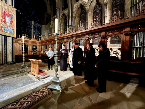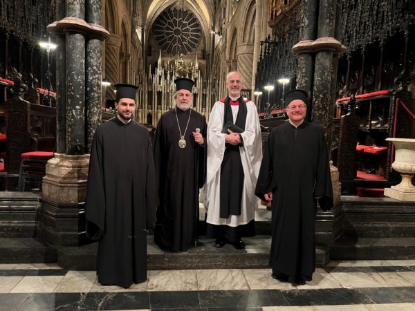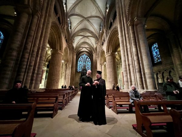On the evening of Saturday, 9th March 2024, His Eminence Archbishop Nikitas of Thyateira and Great Britain attended Evensong at the historic Durham Cathedral. Accompanied by Archdeacon Dr George Tsourous and Reverend Presbyter Professor Nikita Banev, they were warmly received by the Dean of Durham, the Very Reverend Dr Philip Plyming, and Reverend Canon Michael Hampel, Vice-Dean and Precentor.