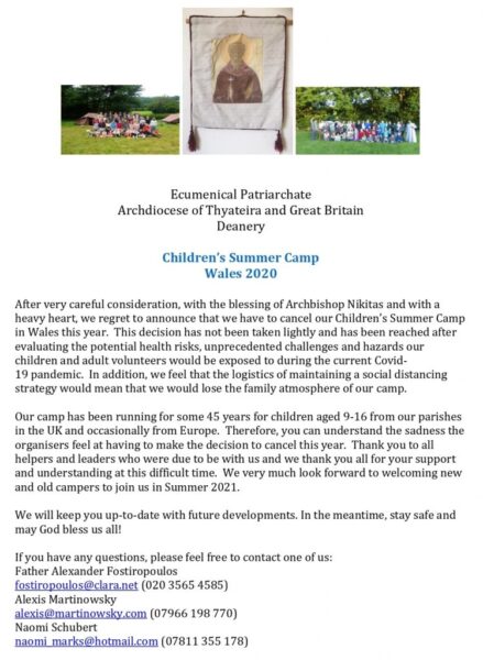 Archdiocese of Thyateira & Great Britain – Deanery Summer Camp 2020 cancelled