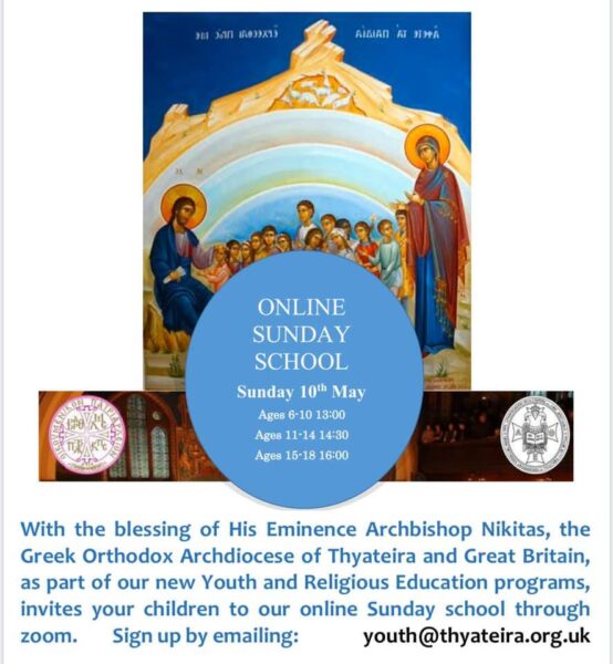 This coming Sunday the 10th May, through Zoom: 1300 for 6-10y 1430 for 11-14y 1600 for 15-18y Please sign up by sending an email to [email protected], clarifying which session you wish to join, and the relevant link will be sent. thyateira.org.uk