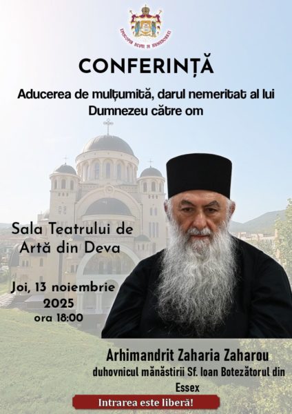 Joi, 13 noiembrie 2025, de la ora 18:00, părintele arhimandrit Zaharia Zaharou, de la Mănăstirea „Sfântul Ioan Botezătorul” din Essex, Anglia, va susține la Teatrul de Artă din Deva conferința intitulată „Aducerea de mulțumită, darul nemeritat al lui Dumnezeu către om”.