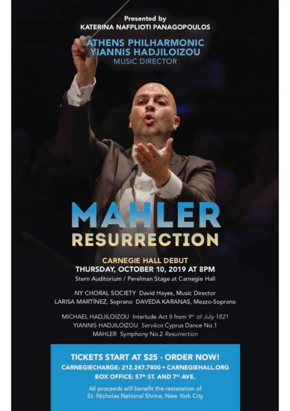 NEW YORK – Yiannis Hadjiloizou, conducting the Athens Philharmonic in Gustav Mahler’s Symphony No. 2, “Resurrection,” will debut at Carnegie Hall on Thursday, October 10, 2019 at 8 p.m. to benefit Saint Nicholas Church and National Shrine.