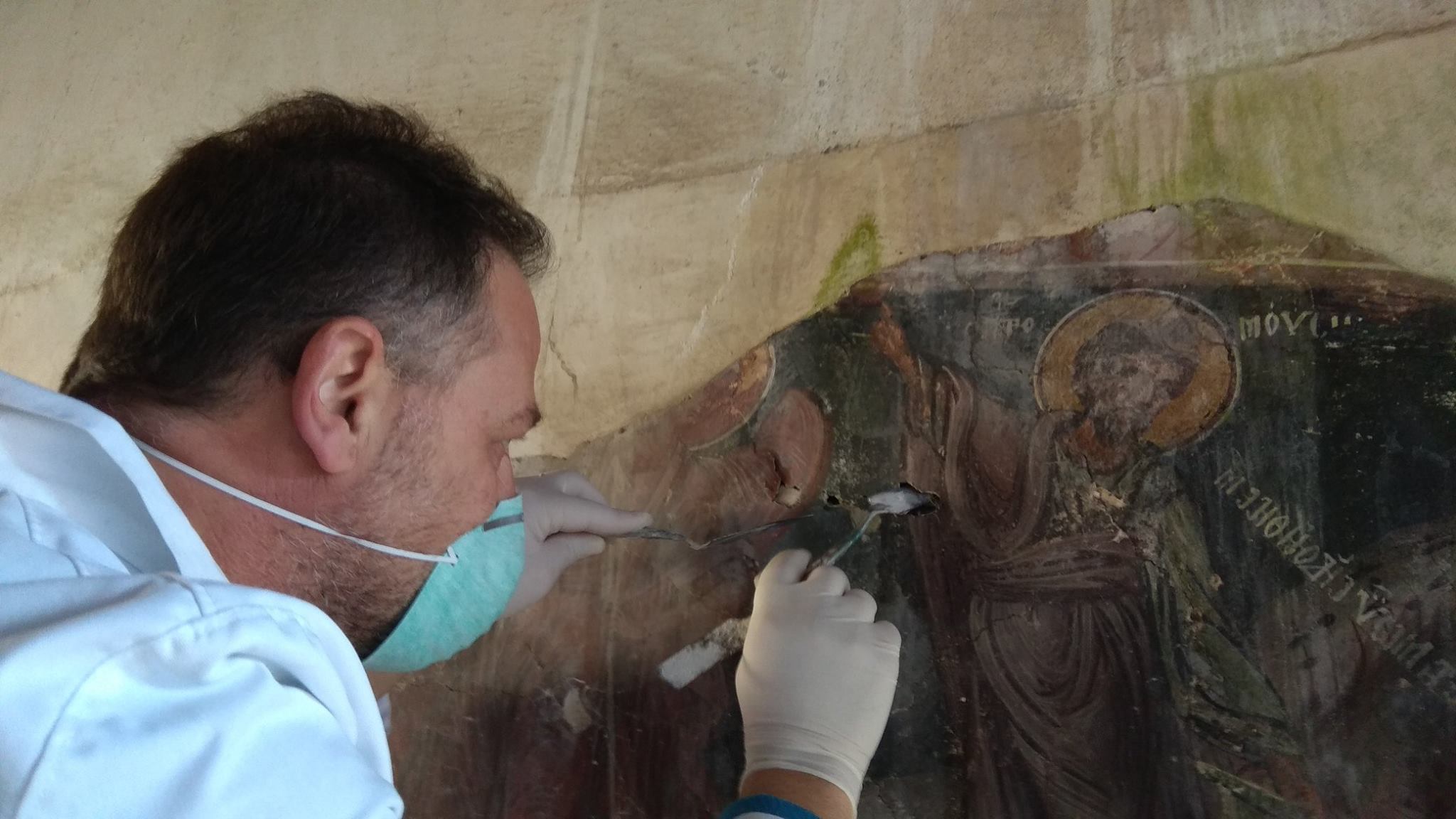 Specialistët e sektorit të artit të DRKK-Berat prej disa ditësh janë duke punuar në afreskun e kishës së Shën Mitrit. Ndërhyrja konsiston në konsolidimin e shtresës së suvasë me shtresën përgatitore në pjesën e hajatit. Një punë sa delikate dhe e domosdoshme për mbrojtjen e afreskut në kushtet e vështira të temperaturave të ulëta dhe lagështirës të muajve të dimrit.