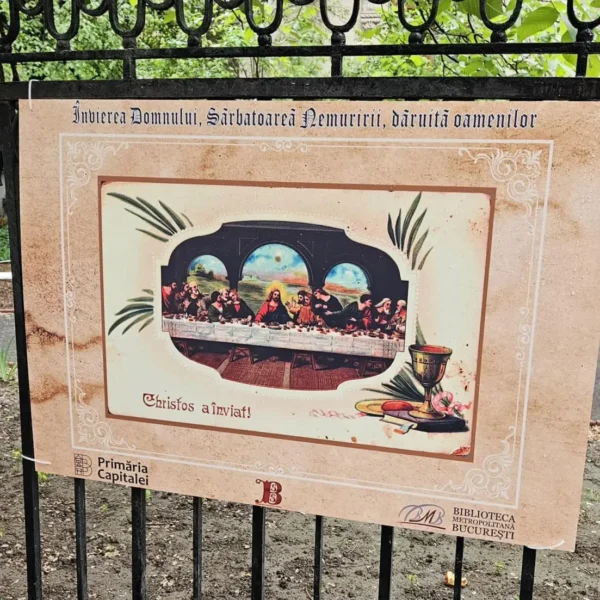 60 de ilustrate de Paști din colecția Bibliotecii Sfântului Sinod, vechi de aproape un secol, sunt reproduse pe panouri mobile și pe bannere instalate pe gardul exterior al instituției.
