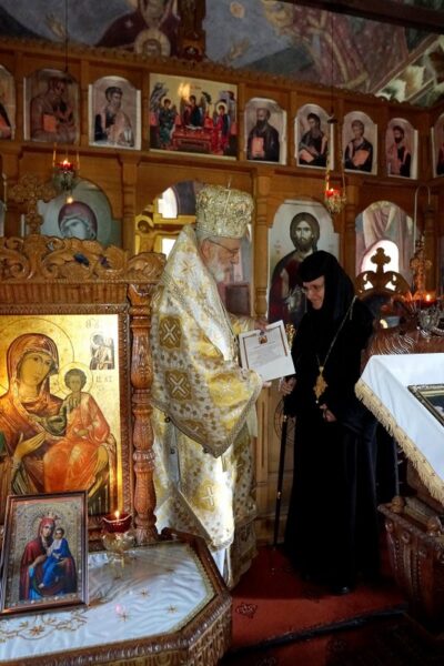 În chip simbolic, pentru a scoate în evidență implicarea și devotamentul monahiilor de la schitul Brătășești, astăzi, în Duminica Sfintelor Femei Mironosițe, Înaltpreasfinția Sa a oficiat slujba de instalare pentru noua stareță în persoana egumenei Efrema Drăghici care a primit și distincția eparhială ,,Crucea Basarabă”