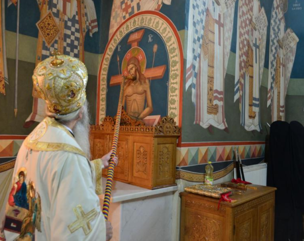 După ce zidurile exterioare au fost binecuvântate cu Sfântul Mir și apă sfințită, clericii au târnosit și pecetluit sfânta masă, iar înainte de oficierea Sfintei Liturghii, PS Galaction le-a citit celor de față rugăciunea cea mare de dezlegare. Răspunsurile liturgice au fost oferite de elevii Corului „Basileus” al Seminarului Teologic Ortodox „Sfântul Vasile cel Mare”, dirijat de diac. Mihail Ursache,