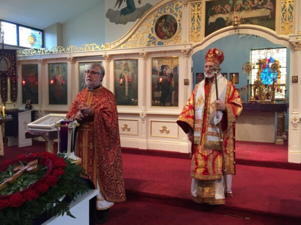 As the Matins service proceeded, His Grace led us in the Solemn Procession of the Holy and Precious Cross at the end of the Great Doxology, and after venerating the Cross, (beautifully adorned with flowers), joyfully began the Hierarchical Liturgy. During the Holy Liturgy, there was a palpable sense of solemnity and holiness in the manner that His Grace led us in prayer, culminating in his magnificent Homily on the Place of the Cross in our lives – and how we must respond to it. It was readily apparent to all of the faithful listening to his homily that our Bishop is truly gifted with the ability to Preach the Word of God, and all of us were so thankful for this blessing!
