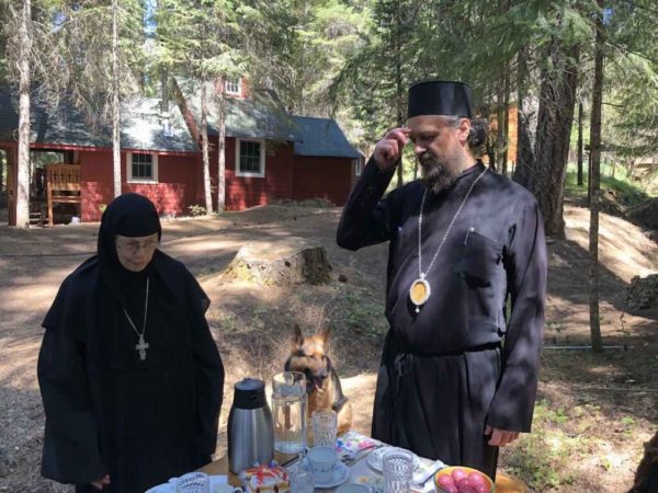 His Grace was greeted by the Abbott of the monastery, Hieromonk Damascene, and the brotherhood together with Abbess Dorothea and the sisterhood from the St. Xenia Monastery in Wildwood, California.