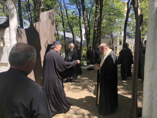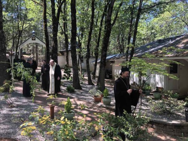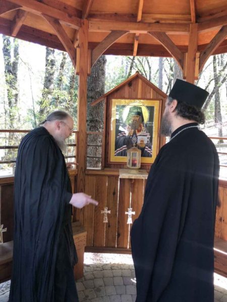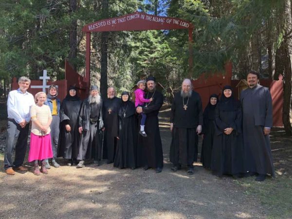 His Grace was greeted by the Abbott of the monastery, Hieromonk Damascene, and the brotherhood together with Abbess Dorothea and the sisterhood from the St. Xenia Monastery in Wildwood, California.
