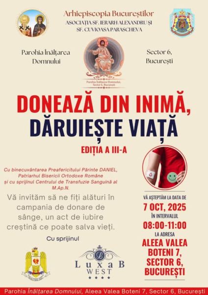 Credincioșii bucureșteni sunt invitați să participe la o nouă campanie de donare de sânge, organizată în data de 7 octombrie la Biserica „Înălțarea Domnului” din Sectorul 6 al Capitalei.