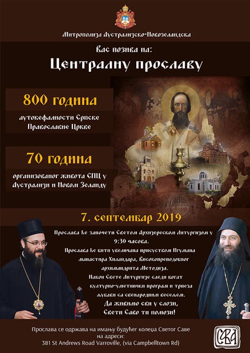 The central celebration of the 800 years of the autocephaly of the Serbian Orthodox Church and 70th anniversary of the organized life of the Serbian Orthodox Church in Australia and New Zealand will be held on 7 September 2019 on the property of the Saint Sava College in Varroville, Sidney.