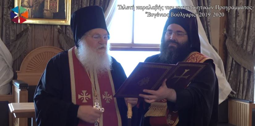 A ceremony awarding certificates to candidates that successfully completed the Evengios Voulgaris program for Advanced Studies in Orthodox Spiritual Life and Theology, which was held at the Holy and Great Monastery of Vatopedi, on Mount Athos.