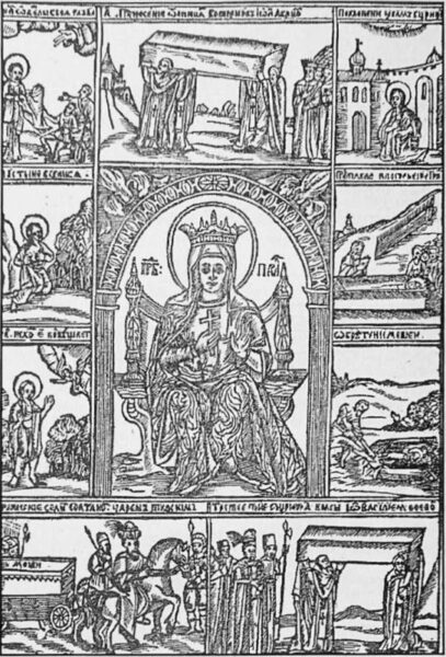 În studiul „Iconografia populară a Sfintei Parascheva”, publicat de Letiția-Mirela Cristea, muzeograf la Muzeul Țăranului Român București, în Anuarul Muzeului Etnografic al Moldovei (2018), în gravura mai sus pomenită „central este înfățișată Sfânta stând pe un tron, iar pe margini sunt reprezentate scene din viața ei: împărțirea hainelor sale săracilor, stabilirea în deșert, anunțarea de către înger că trebuie să se întoarcă în patria sa, închinarea la bisericile importante din Constantinopol, descoperirea moaștelor sale și, la final, cele trei mutări ale osemintelor sale”.