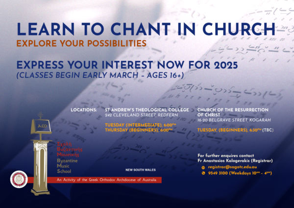 With the blessing of His Eminence Archbishop Makarios of Australia, the New South Wales branch of the school, based in Sydney, is preparing for the 2025 academic year, during which it will offer Byzantine music lessons: a) for boys and girls aged 8 to 15, and b) for youth aged 16 and older, as well as adults.
