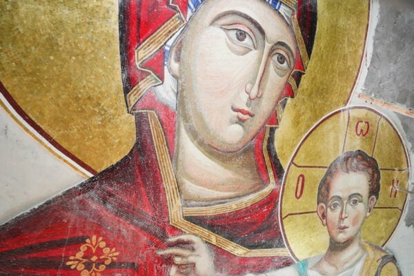 În absida altarului, pictorii au montat deja icoana Macii Domnului Platytera, fiind cea mai mare reprezentare a Maicii Domnului în mozaic din România.