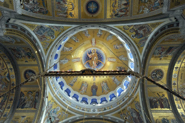 The church is adorned with beautiful mosaics of Christ the Pantocrator with a 66-ft. arm span, the Mother of God, and the Nativity of Christ, scenes from the Old and New Testaments, and Serbian saints, covering an area of more than 161,000 square feet and weighing more than 320 tons, making it a unique church in the Orthodox world. 24-karat gold was used in the mosaics. Especially monumental are the mosaics of the creation of the world, overseen by the Ascension of Christ in the main dome.