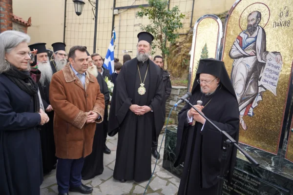 Subsequently, His All-Holiness made a pilgrimage visit to the parish churches of Panagia Evangelistria at the Evangelistria Cemeteries and of Apostle Paul in the same-name Municipal District of the city, as well as to the Estate of the Philoptochos Brotherhood of Men of Thessaloniki, where he inaugurated a mosaic of the Apostle Paul in the courtyard of the namesake historic church. He then proceeded to the Parish Church of Saint Paraskevi of the Stavroupolis Cemeteries, where he was warmly received by the Shepherd of the flock, His Eminence Metropolitan Barnabas of Neapolis and Stavroupolis, together with a multitude of the faithful.