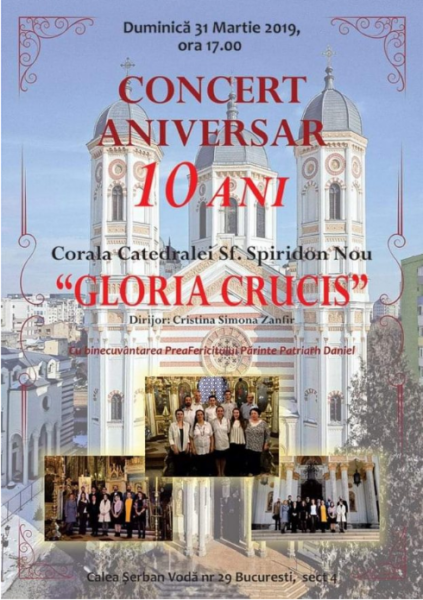 Corala „Gloria Crucis” a Catedralei Mitropolitane „Sfântul Spiridon Nou” din București aniversează duminică, 31 martie 2019, împlinirea a zece ani de la înființare.