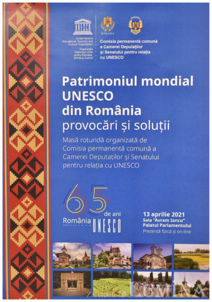 Comisia permanentă comună a Camerei Deputaților și Senatului pentru relația cu UNESCO marchează în această perioadă împlinirea a 65 de ani de prezență românească în Organizaţia Naţiunilor Unite pentru Educaţie, Ştiinţă şi Cultură printr‑o serie de activități. Evenimentele au debutat marți, 13 aprilie 2021, în Sala „Avram Iancu” a Palatului Parlamentului, cu o masă rotundă cu tema „Patrimoniul mondial UNESCO din România, provocări și soluții”, cu ocazia Zilei internaționale a monumentelor și siturilor UNESCO, sărbătorită în fiecare an la 18 aprilie.