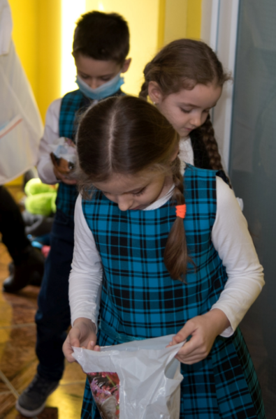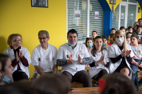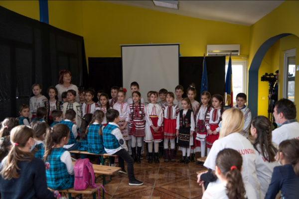 În semn de apreciere a voluntarilor, la sfârşitul prezentării, un grup de elevi îmbrăcaţi în costume populare a susţinut un scurt program artistic, iar voluntarii le-au oferit tuturor copiilor produse de igienă orală.