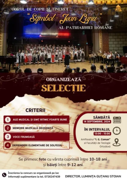 Copiii talentați la muzică pot cânta în Corul de copii și tineret „Symbol – Jean Lupu” al Patriarhiei Române. Sâmbătă vor avea loc selecțiile.