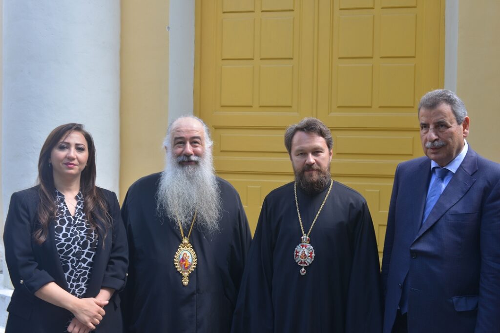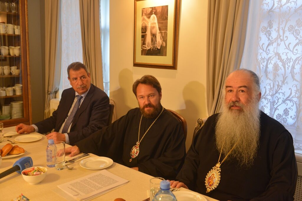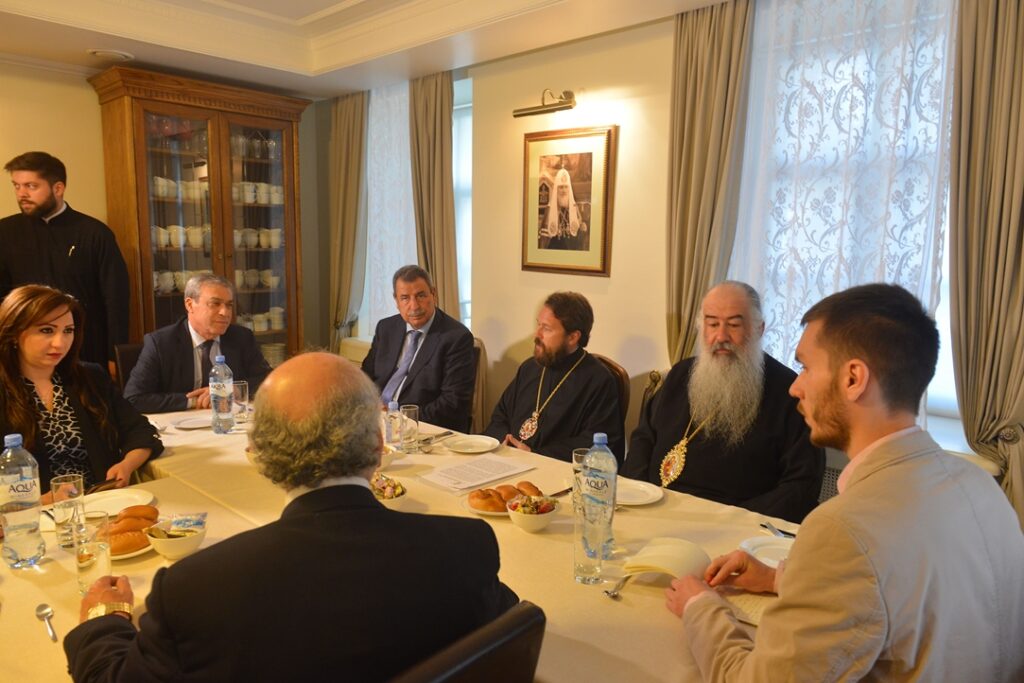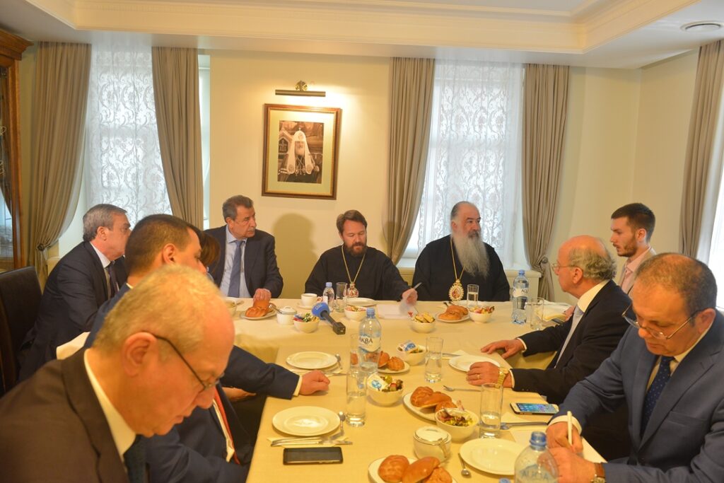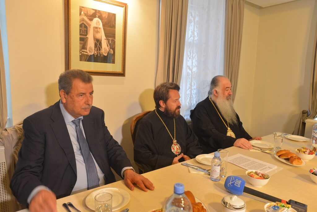 On May 22, 2019, the Day of the Translation of the Relics of St Nicholas the Wonderworker from Myra of Lycia to Bar, Metropolitan Hilarion of Volokolamsk, head of the Moscow Patriarchate department for external church relations (DECR), after the celebration of the Divine Liturgy at the church of Our Lady the Joy to All the Afflicted-in Bolshaya-Ordynka, received a delegation a delegation of the Palestinian Supreme Presidential Committee for Churches’ Affairs led by Minister Ramzi Khouri, at the parish house. The delegation also included Archbishop Christophoros of Kyriakoupolis, the Patriarchate of Jerusalem.