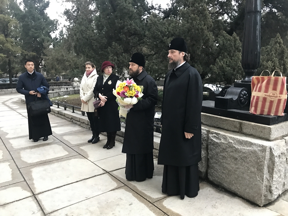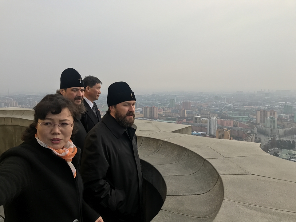 That same day the DECR chairman, together with Archbishop Sergy of Solnechnogorsk, administrator of the Moscow Patriarchate’s parishes in East and Southeast Asia, Russian Ambassador Alexander Matsegora, and other members of the Russian Church’s delegation visited the Kumsusan Palace and other sights in Pyongyang, and laid flowers to the monument to the Soviet soldiers on Moranbong Hill. At the memorial cross at the Soviet cemetery in the Sadong district, the DECR chairman celebrated a requiem litiya for the deceased compatriots.