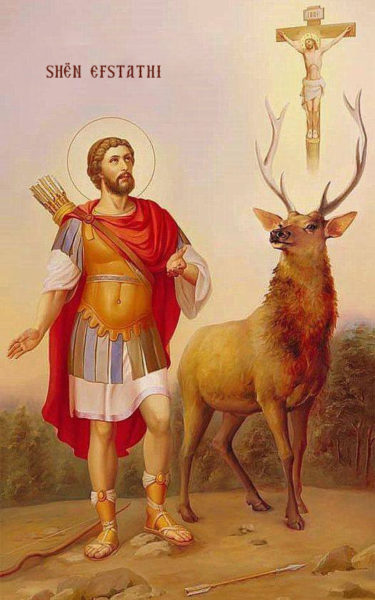 Një ditë, kur Plakida po gjuante në pyll dhe kishte marrë në shenjë një dre të madh, vuri re midis brinjëve të tij një Kryq më të shndritshëm sesa dielli, mbi të cilin pa Krishtin. Ai dëgjoi një zë që i tha: “Plakida, pse më ndjek? Unë jam Krishti të Cilin ti e nderon në mënyrë të pavullnetshme me anë të punëve të tua të mira. Unë erdha mbi dhé në formë njerëzore për të shpëtuar gjininë njerëzore dhe t’u shfaqa sot për të të kapur në rrjetat e dashurisë sime për njeriun”. I habitur dhe i tmerruar, Plakida ra nga kali dhe mbeti pa ndjenja për disa orë. Vizioni i tij u vërtetua edhe një herë tjetër kur Krishti iu shfaq për herë të dytë dhe i dha të kuptojë se Ai nga natyra është Perëndi, Bërësi i qiellit dhe i dheut, i Cili për hir të dashurisë për njerëzimin mori natyrën njerëzore. Atëherë Plakida besoi në thellësi të qenies së tij dhe u pagëzua bashkë me gruan dhe fëmijët. Të gjithë i ndryshuan emrat, prindërit u quajtën Efstath dhe Theopisti, kurse fëmijët Agapi dhe Theopisti.