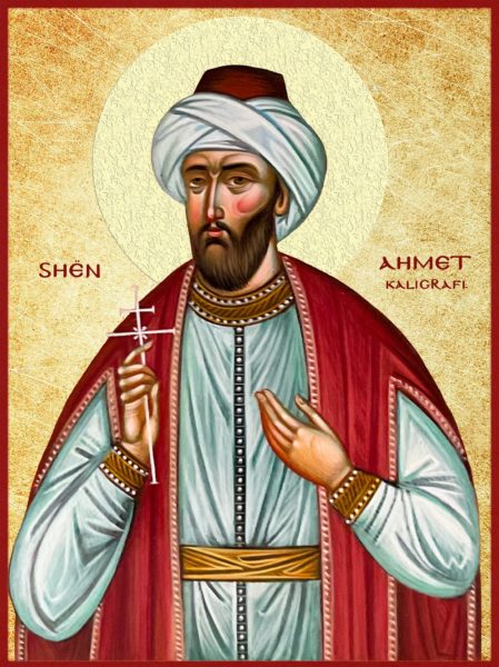 Shën Ahmeti ishte me origjinë nga Konstandinopoja dhe prindërit e kishin rritur me besimin mysliman. Ishte kaligrafi i dytë në sekretarinë e sulltanit dhe kishte pozitë sociale me rëndësi. Nuk ishte martuar, por bashkëjetonte me një nga skllavet e krishtera, me origjinë nga Rusia. Një robinjë tjetër ruse, grua e moshuar dhe e perëndishme, e kishte zakon të shkonte në kishë ditët e të kremteve dhe t’i sillte mikes së saj naforë dhe ujë të bekuar. Një të kremte, Ahmeti vuri re se goja e gruas lëshonte aromë të mirë. E pyeti se ç’kishte ngrënë dhe ajo, pas kërkesash të vazhdueshme, iu përgjigj se kishte ngrënë bukën e bekuar që i kishin sjellë.