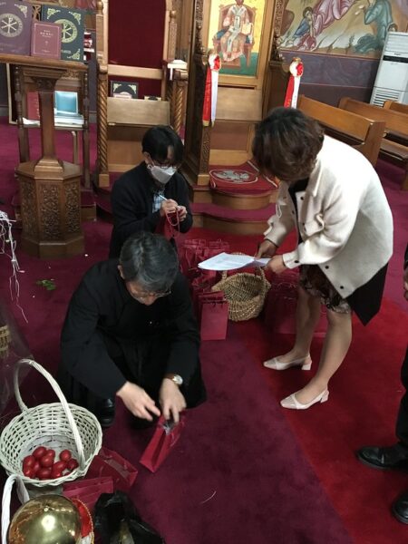 On Easter Sunday, after the Vespers of Love, which was celebrated, with «the doors clesed», just like the rest of the Holy Services of Holy Week, our Clergy along with members of the Church Council of the Cathedral of St. Nicholas Seoul, organized in mall groups visited the houses of our Orthodox faithful and the catechumens to exchange with them the Paschal greeting: “Christ is Risen” and to hand them the Easter eggs as well as portion of the Holy Unction.