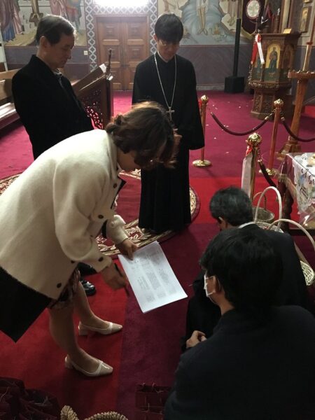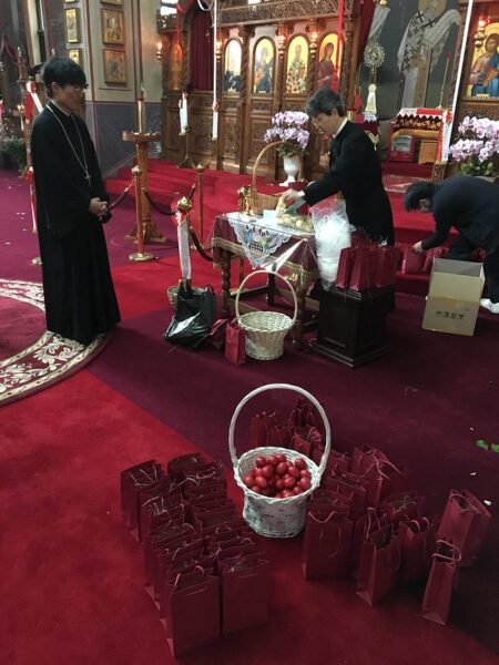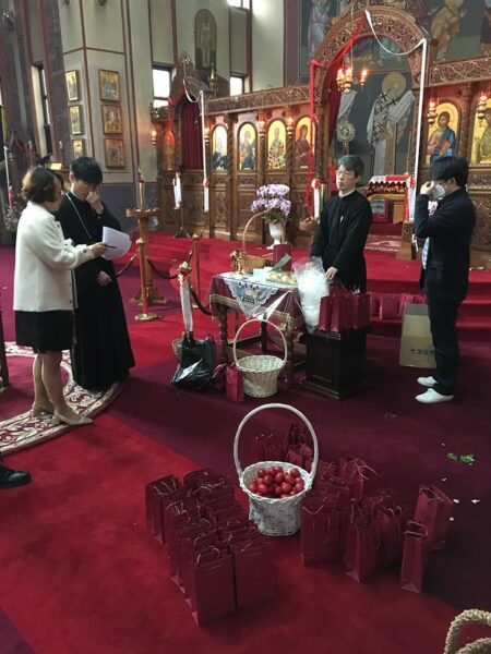 On Easter Sunday, after the Vespers of Love, which was celebrated, with «the doors clesed», just like the rest of the Holy Services of Holy Week, our Clergy along with members of the Church Council of the Cathedral of St. Nicholas Seoul, organized in mall groups visited the houses of our Orthodox faithful and the catechumens to exchange with them the Paschal greeting: “Christ is Risen” and to hand them the Easter eggs as well as portion of the Holy Unction.