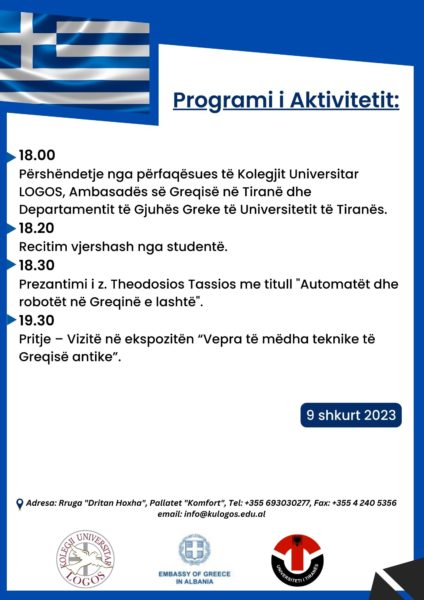 Aktiviteti do të shoqërohet me një ekspozitë fotografike dhe shfaqje filmash me temën “Veprat e mëdha teknike të Greqisë antike “, e cila do të jetë e hapur për publikun e gjerë nga data 9 shkurt deri më 10 mars në katin përdhes të Kolegji Universitar “LOGOS”.