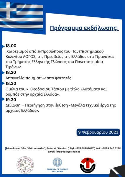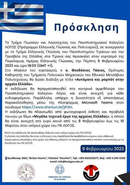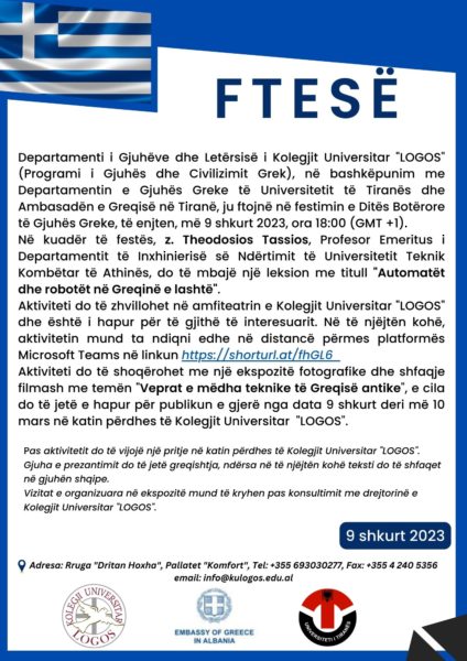 Departamenti i Gjuhëve dhe Letërsisë i Kolegjit Universitar “LOGOS” (Programi i Gjuhës dhe Civilizimit Grek), në bashkëpunim me Departamentin e Gjuhës Greke të Universitetit të Tiranës dhe Ambasadën e Greqisë në Tiranë, ju ftojnë në festimin e Ditës Botërore të Gjuhës Greke, të enjten, më 9 shkurt 2023, ora 18:00 (GMT +1).