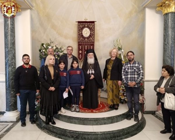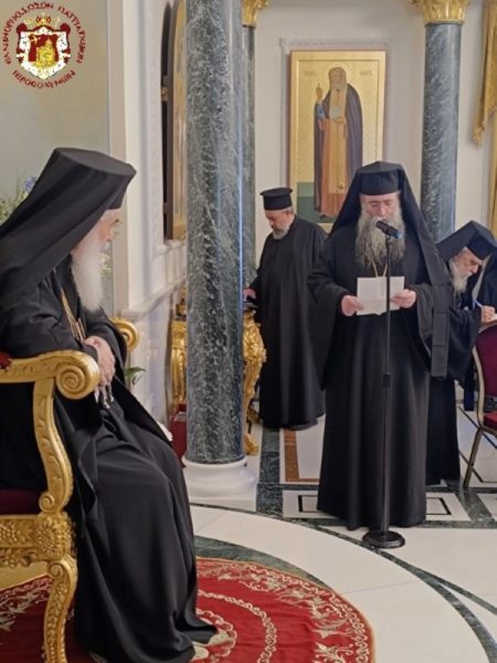 Regarding all the above, we call upon all those who prayed with Us and honoured with their presence the enthronement anniversary of Ours, wishing them power from on high, the illuminating energy of the Holy Sepulchre and every blessing from God, expressing warm thanks and to those addressing Us, the Elder Chief Secretary, His Eminence Archbishop Aristarchos of Constantina, speaking on behalf of the honorable members of the Holy Synod and the respected Brothers of our Holy Sepulchre Brotherhood, His Excellency the Consul General of Greece, Mr Dimitrios Angelosopoulos, the Ambassador of Russia to Israel Mr Anatoly Victorov, the representative of the Holy Church of Russia,Reverend Archimandrite Vassianos, who conveyed the wished of His Beatitude the Patriarch of Moscow Cyril, the reverend representative of the Holy Church of Romania, Archimandrite Theophilos, who conveyed the wishes of His Beatitude the Patriarch of Romania Daniel, His Eminence the Metropolitan Kyriakos of Nazareth, whose address was read by the Elder Chief Secretary, His Eminence the Metropolitan Benediktos of Diosaecarea, who spoke on behalf of our flock in Bethlehem, His Eminence Archbishop Damascene of Yaffo, who spoke on behalf of our flock in Yaffo, His Eminence Archbishop Aristovoulos of Madaba, who spoke on behalf of the Russian speaking Beer Sheba community and that of Haifa, the reverend Archimandrite Ignatios, who spoke on behalf of our flock in Beit Jala and Beit Sahour, the reverend Fr Farah Bandour, who spoke on behalf of Saint James Cathedral parish, Mr Samaan, who spoke on behalf of Ramallah and Taybe areas, the new Principal of Saint Dimitrios’ School Mr Arges and the students, Mr Yusef Nasser, and Mr Athanasios Abu Aeta, and all who participated in this celebration.”
