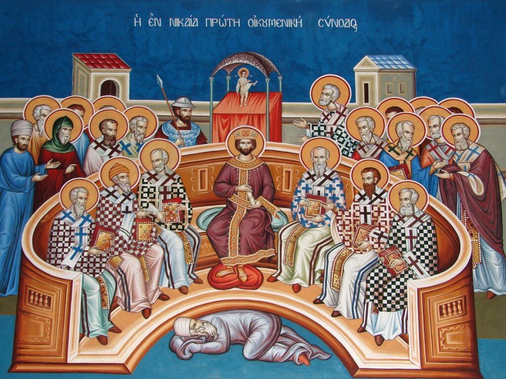 Pra, ne u thurim lavde korit të hyjnderuar të Etërve të shenjtë, të cilët u mblodhën nga çdo skaj i tokës dhe formuluan doktrinën lidhur me marrëdhënien e Krishtit me Atin, rreth të qenit i “njëqenshëm” me Atin. Me pak fjalë, formuluan dhe shprehën besimin e saktë të Kishës. Nga troparet e së kremtes, shkëpusim troparin karakteristik, lavdinë e lavdërimeve, në tingullin tërthor të të katërtit, i cili është shumë i njohur për kompozimin dhe për vijën e tij melodike: