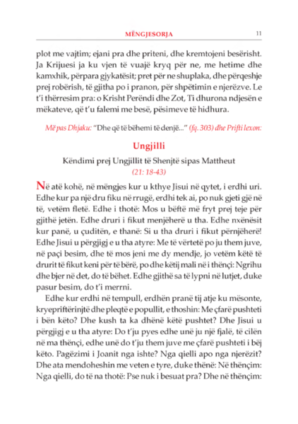 Edhe në mëngjes kur u kthye në qytet, i erdhi uri. Edhe kur pa një fik në rrugë, erdhi tek ai, po nuk gjeti gjë në të, veç fletë vetëm. Edhe i thotë: Mos u bëftë më fryt prej teje për gjithë jetën. Edhe fiku menjëherë u tha. Edhe nxënësit kur panë, u çuditën, e thanë: Si u tha fiku përnjëherë?! Edhe Jisui u përgjigj e u tha atyre: Me të vërtetë po ju them juve, në paçi besim, edhe të mos jeni me dy mendje, jo vetëm këtë të fikut keni për të bërë, po dhe këtij mali në i thënçi: Ngrihu dhe bjer në det, do të bëhet. Edhe gjithë sa të kërkoni në lutje, duke besuar, do t’i merrni.