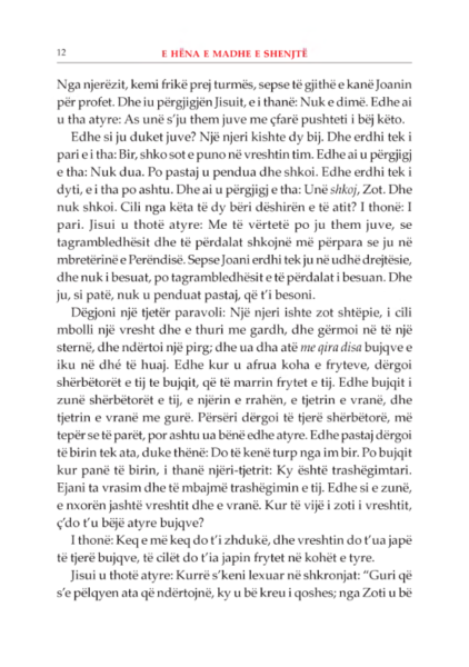 Dëgjoni një tjetër paravoli: Një njeri ishte zot shtëpie, i cili mbolli një vresht dhe e thuri me gardh, edhe gërmoi në të një tirë, edhe ndërtoi një pirg; edhe ua dha atë me qira bujqve e iku në vend tjetër. Edhe kur u afrua koha e të vjelave, dërgoi shërbëtorët e tij te bujqit, që të marrin frytet e tij. Edhe bujqit i zunë shërbëtorët e tij, e njërin e rrahën, e tjetrin e vranë, edhe tjetrin e vranë me gurë. Përsëri dërgoi të tjerë shërbëtorë, më tepër se të parët, por ashtu ua bënë edhe atyre. Edhe pastaj dërgoi të birin tek ata, duke thënë: Do të kenë turp nga im bir. Po bujqit kur panë të birin, i thanë njëri-tjetrit: Ky është trashëgimtari. Ejani ta vrasim dhe të përvetësojmë trashëgimin e tij. Edhe si e zunë, e nxorën jashtë vreshtit edhe e vranë. Kur të vijë i zoti i vreshtit, ç’do t’u bëjë atyre bujqve?