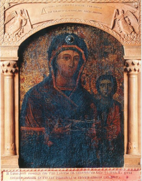 Kjo ikonë mrekullibërëse e së Tërëshenjtës ruhet në Skevofilakion të Skitës së Re. Sipas traditës gojore dhe mbishkrimit që ekziston mbi kornizën e gdhendur prej druri, Turqit e hodhën në zjarr për ta djegur si të ishte dru i zakonshëm, por nuk u dogj. Sipas mënyrës artistike të ndjekur, i përket shek. të XVII.
