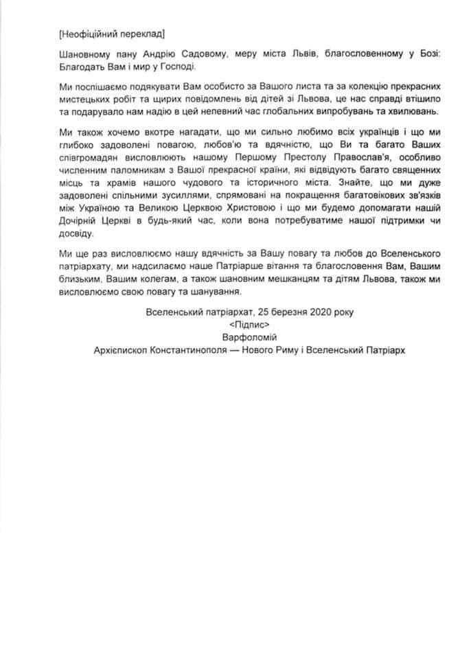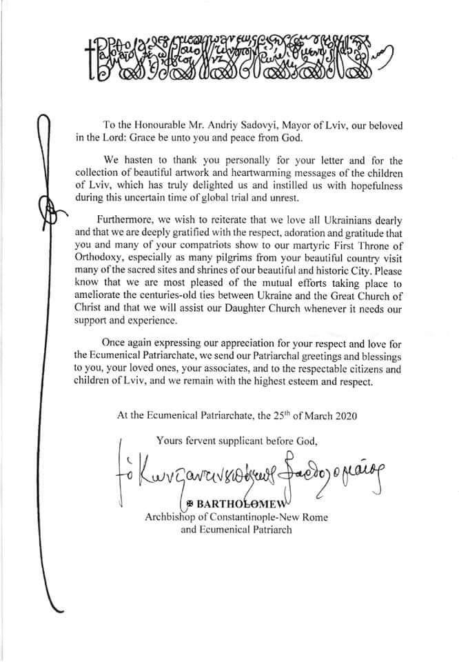 The Director of the Lviv City Council’s Mayor Administration Department published a letter from Patriarch Bartholomew.