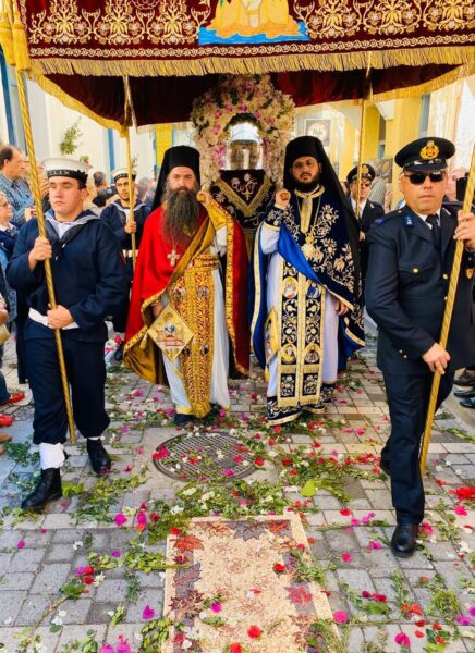 A urmat tradiționala procesiune pe străzile insulei condusă de mai mulți ierarhi ai Bisericii Ortodoxe din Grecia, informează orthodoxianewsagency.gr.